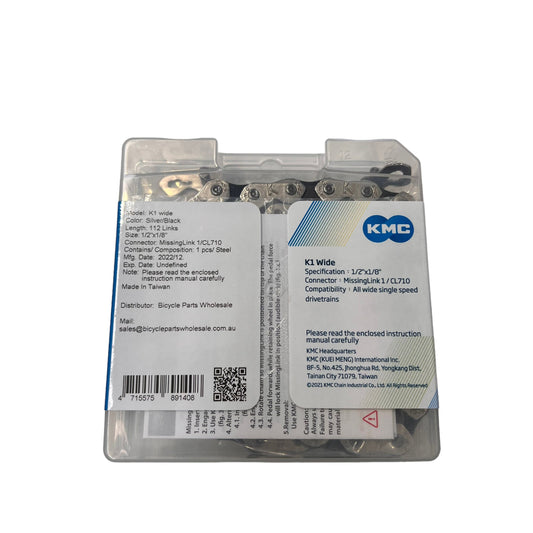 CHAIN 1/2 x 1/8 x 112 links, Single Speed, Freestyle, KMC, K1 Wide. SILVER/BLACK